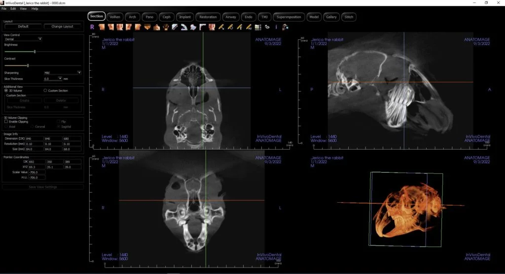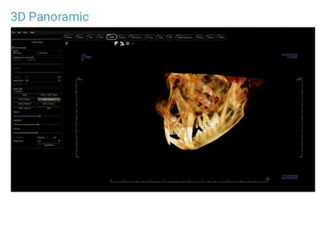 - 3D panoramabildet erstatter behovet for full munnoversikt som tradisjonelt er tatt med 2D røntgen. Ved å gi oss en full 3D-modell av hodeskallen kan vi raskt identifisere rotnummer, eksponerte furkasjoner, resorberte røtter, ankylose og annen patologi vi kanskje ønsker å undersøke nærmere.