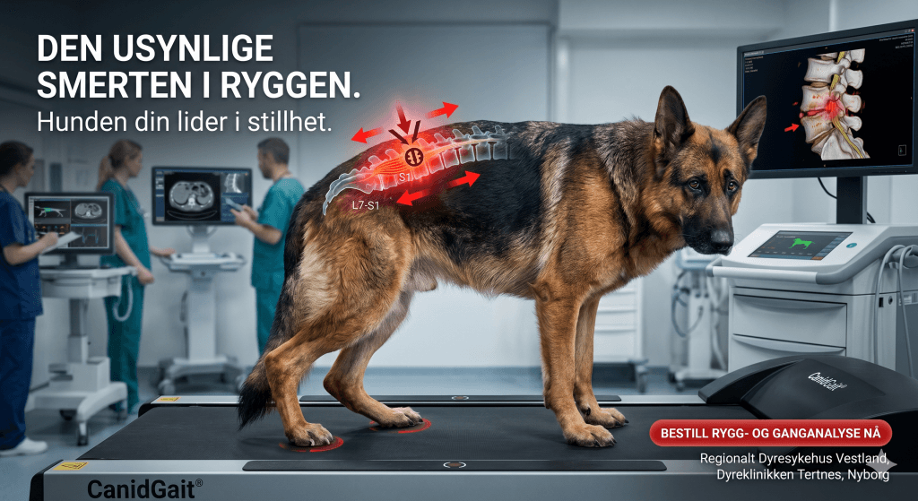Mange hundeeiere slår seg til ro med at hunden «begynner å bli gammel» når den slutter å hoppe inn i bilen eller går saktere i motbakker. Men som eksperter vet vi at sannheten ofte er en annen: Kroniske smerter i nedre del av ryggen som hunden maskerer med alt den har av instinkt.Ved Regionalt Dyresykehus Vestland, Dyreklinikken Tertnes, har vi nå verktøyene som gjør at hunden ikke lenger trenger å lide i stillhet. Ved å kombinere avansert kirurgi med CanidGait® ganganalyse, kan vi dokumentere smerte før den blir synlig for det menneskelige øyet.