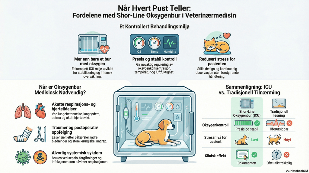 I avansert veterinærmedisin finnes det ingen snarveier. Når pasienten er kritisk syk, er det summen av erfaring, systematikk og riktig utstyr som avgjør utfallet. Shor-Line Oksygenbur (Intensive Care Unit – ICU) representerer nettopp dette: en gjennomprøvd, medisinsk korrekt løsning for stabilisering og intensiv overvåkning av hund og katt med alvorlige tilstander der oksygentilførsel er avgjørende.